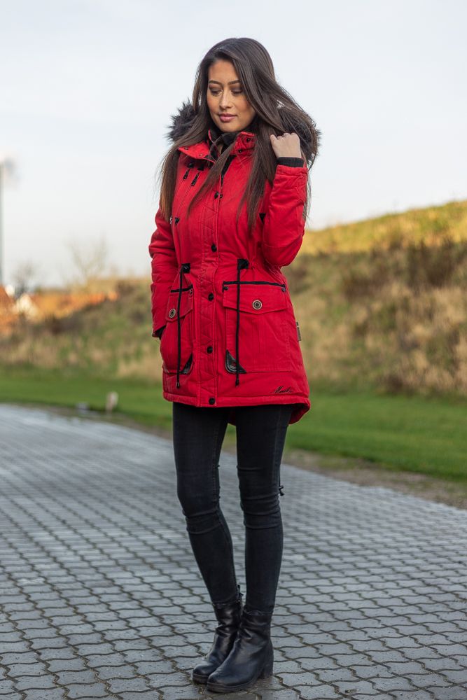 Varm vinter jakke med snøre i taljen og sort faux fur pels krave