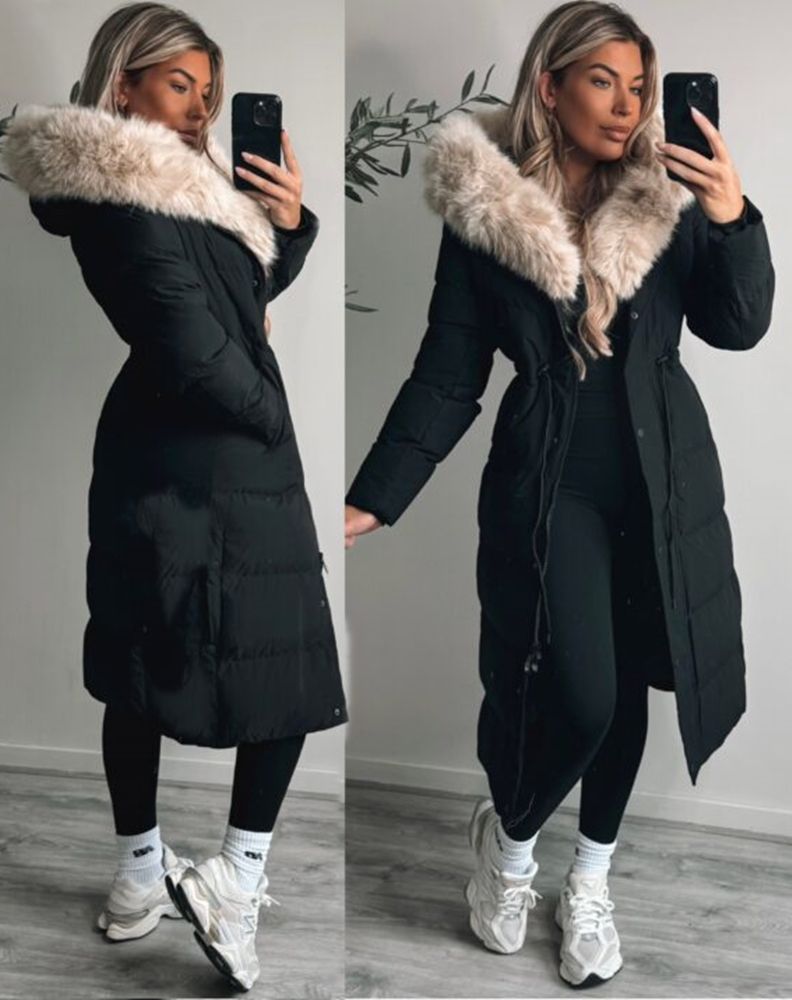 Lång maxi duvet vinterjacka, med bra sidfickor och huva med avtagbar fuskpäls