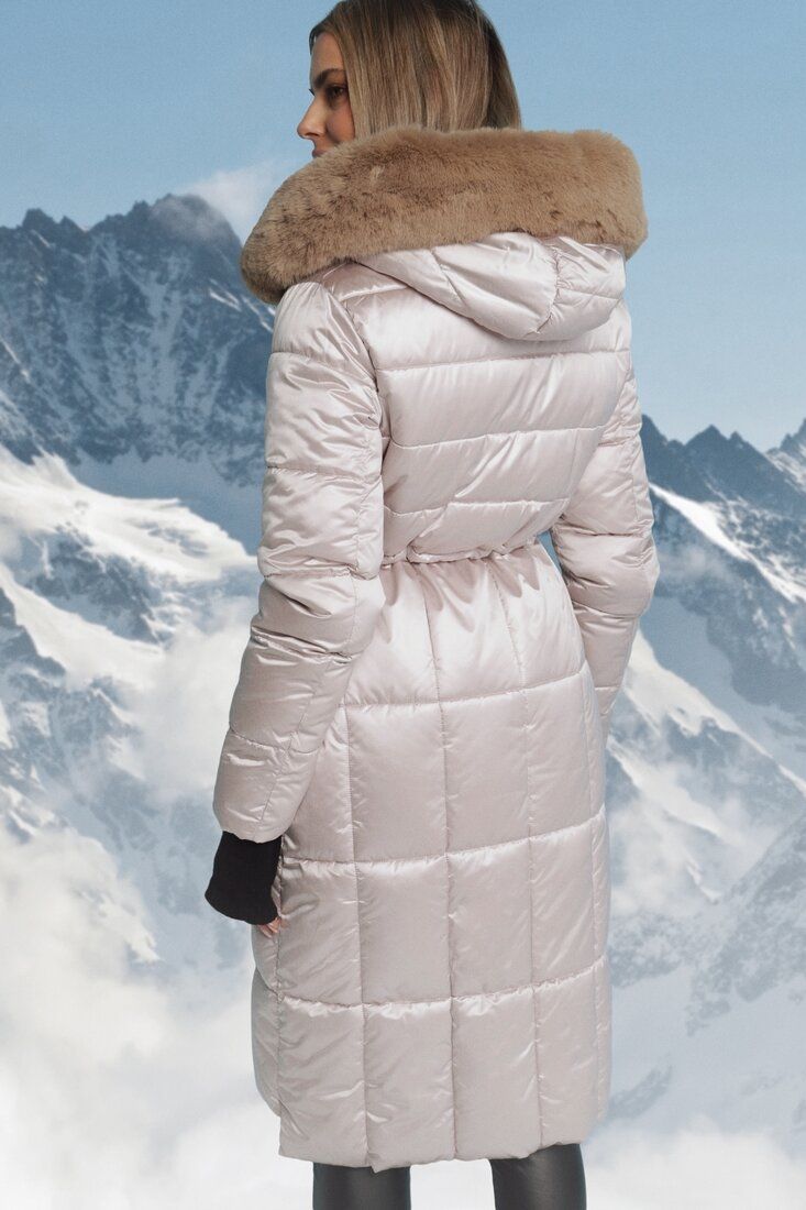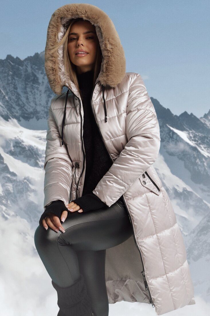 Snygg lång lätt quiltad jacka med päls, och ett långt snitt är ett klart måste för vintersäsongen 2024/25. Modellen har en imponerande stor huva med avtagbar päls, praktiska sidfickor med dekorativa element och stängning med 2-vägs dragkedja och möjlighet att knyta inf i midjan.