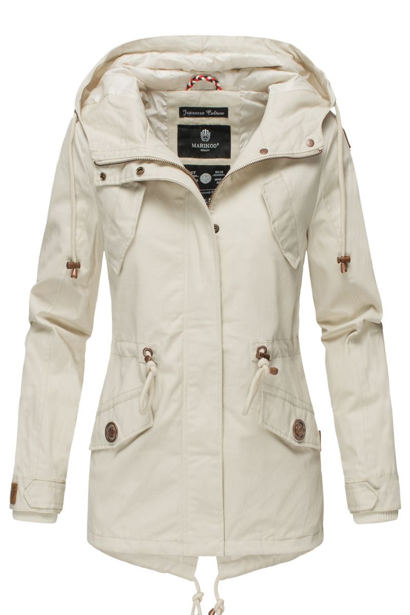 Jakken kan justeres med snøre i taljen.