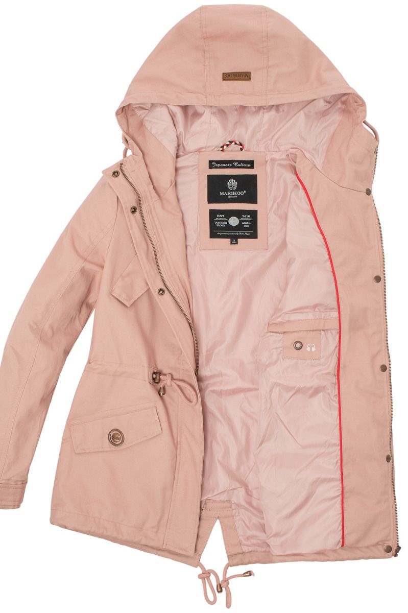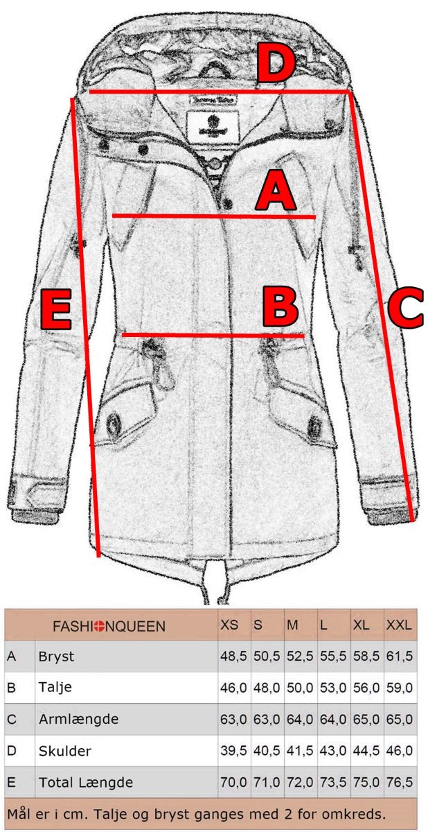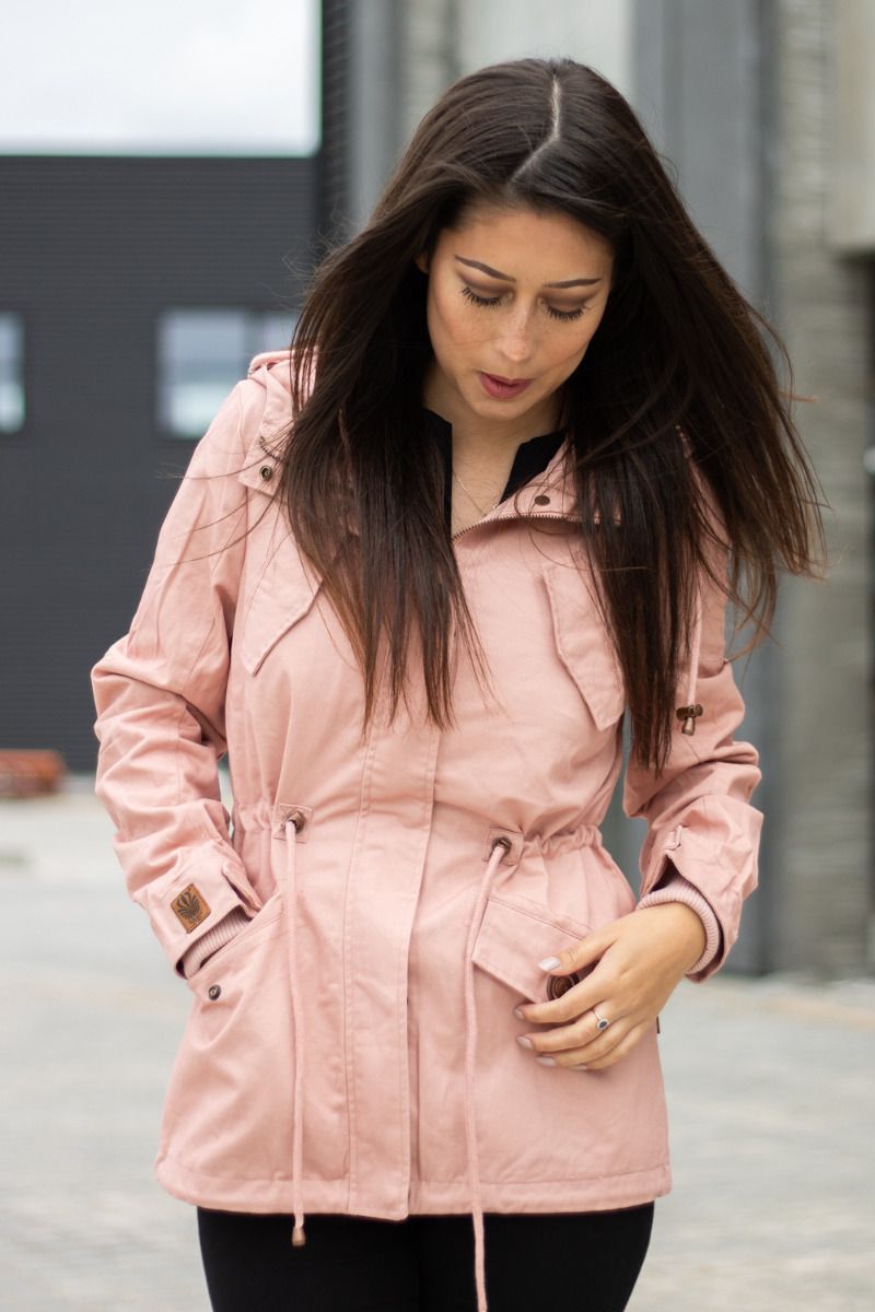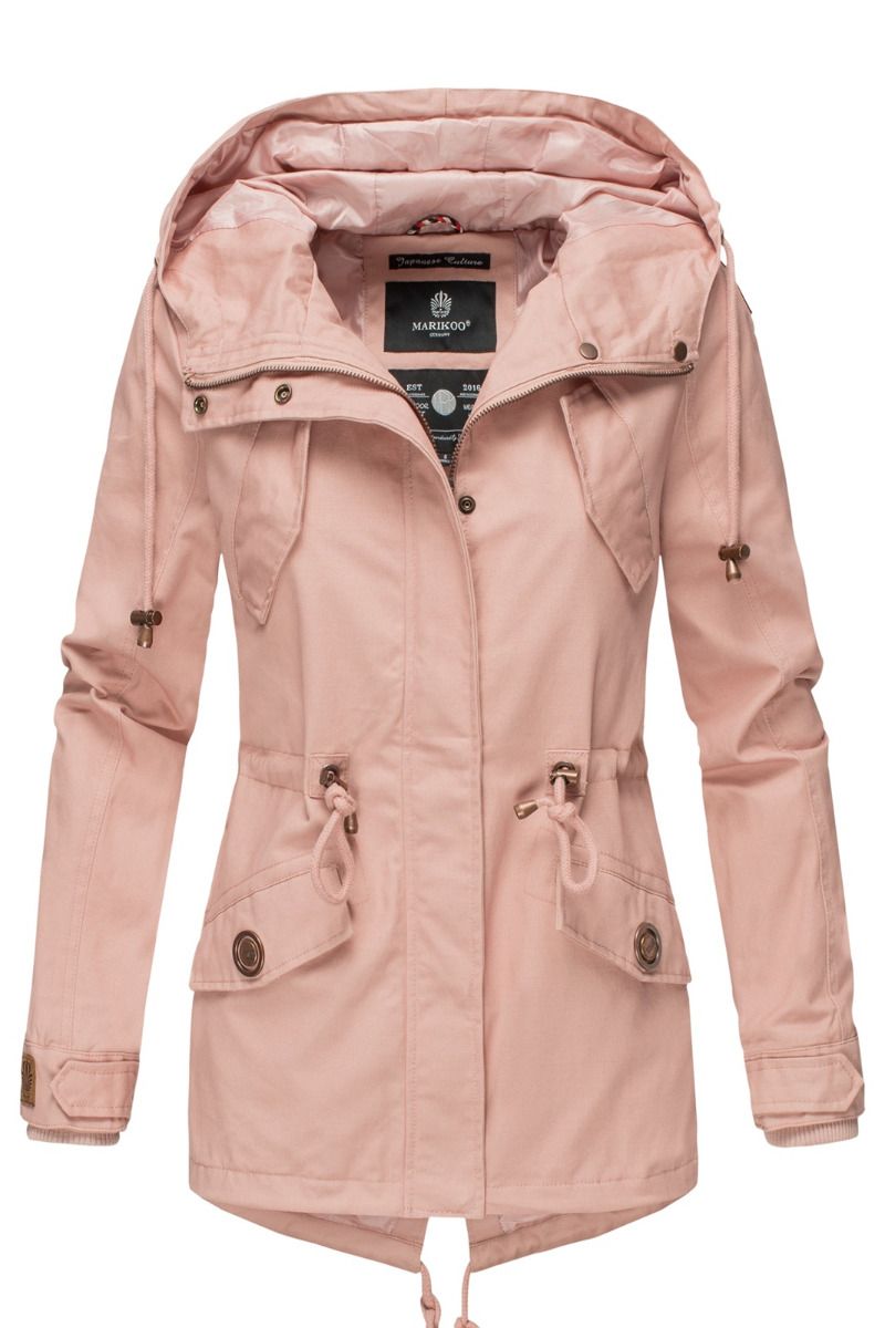 Jakken kan justeres med snøre i taljen.