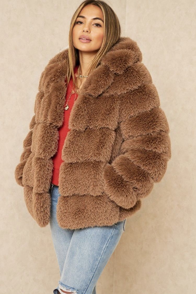 Pälsjacka i fuskpäls med huva i beige