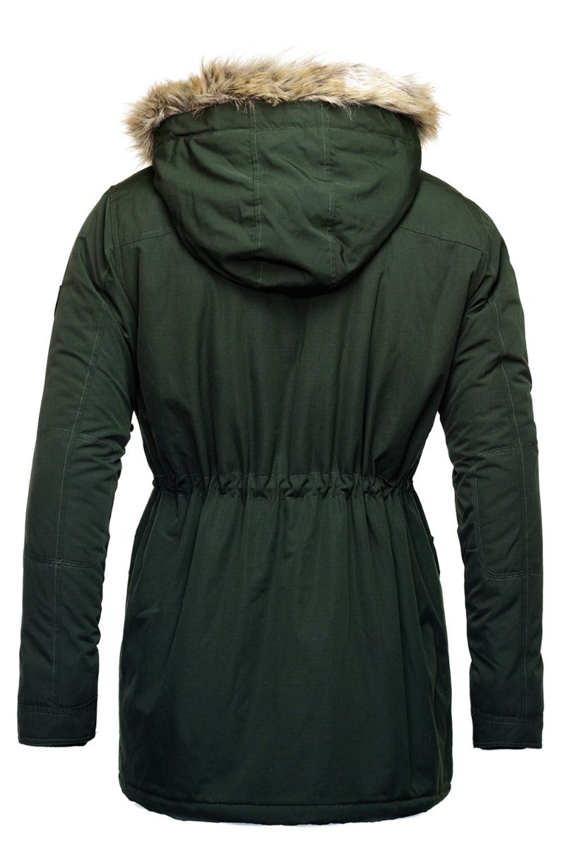 Jakken er foret i selve jakken og har hvidt plys i hætten, pelsen kan tages af.